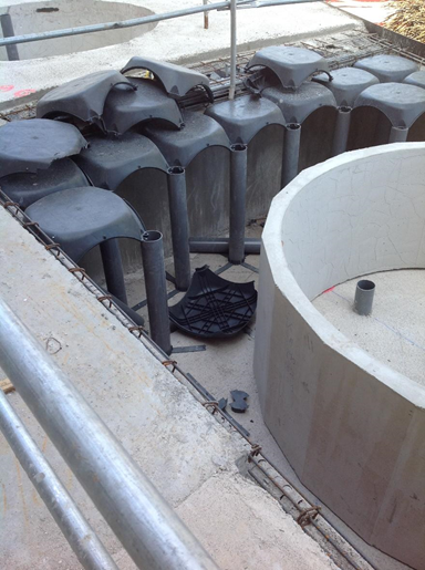 Además de para este uso, el cúpolex se empleó para resolver otros problemas: desde la habitual cámara sanitaria en los garajes hasta los recrecidos para enrasar las soleras con las jardineras en las que se alojan los árboles.